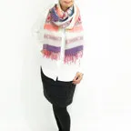スタンダードな大判サイズで、首に巻くことはもちろん、室内でのひざ掛けにも、肩から羽織る使い方もできます。特に羽織りは、パッと華やかにエレガントな雰囲気に変わります。上半身を覆えるので、着ている服を気にせず合わせることができます。忙しい朝もコーディネートを気にする必要はありません。