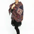 スタンダードな大判サイズで、首に巻くことはもちろん、室内でのひざ掛けにも、肩から羽織る使い方もできます。特に羽織りは、パッと華やかにエレガントな雰囲気に変わります。上半身を覆えるので、着ている服を気にせず合わせることができます。忙しい朝もコーディネートを気にする必要はありません。