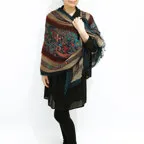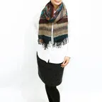 スタンダードな大判サイズで、首に巻くことはもちろん、室内でのひざ掛けにも、肩から羽織る使い方もできます。特に羽織りは、パッと華やかにエレガントな雰囲気に変わります。上半身を覆えるので、着ている服を気にせず合わせることができます。忙しい朝もコーディネートを気にする必要はありません。