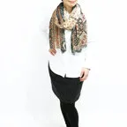非常に大きなショールサイズで、広げて羽織れば上半身をすっぽりと覆うことができます。縦横の長さも十分にあるため、巻き方の自由度が広がります。程よいボリューム感と立体感を簡単につくることができるため、一巻きでこなれた印象になります。面積もあるので、真夏の室内での冷房対策や膝掛けとしても使いやすくなっています。