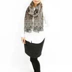 スタンダードな大判サイズで、首に巻くことはもちろん、室内でのひざ掛けにも、肩から羽織る使い方もできます。特に羽織りは、パッと華やかにエレガントな雰囲気に変わります。上半身を覆えるので、着ている服を気にせず合わせることができます。忙しい朝もコーディネートを気にする必要はありません。