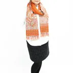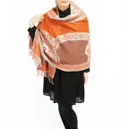 スタンダードな大判サイズで、首に巻くことはもちろん、室内でのひざ掛けにも、肩から羽織る使い方もできます。特に羽織りは、パッと華やかにエレガントな雰囲気に変わります。上半身を覆えるので、着ている服を気にせず合わせることができます。忙しい朝もコーディネートを気にする必要はありません。