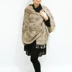 スタンダードな大判サイズで、首に巻くことはもちろん、室内でのひざ掛けにも、肩から羽織る使い方もできます。特に羽織りは、パッと華やかにエレガントな雰囲気に変わります。上半身を覆えるので、着ている服を気にせず合わせることができます。忙しい朝もコーディネートを気にする必要はありません。