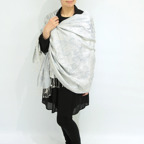 スタンダートな大判サイズで巻いても羽織っても、どちらも使いやすいタイプです。特に羽織は全体の印象がパッと華やかに、エレガントな雰囲気に変化します。
