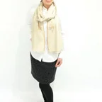 195cm×100cm大判ショールサイズで、巻きでも羽織でもどちらも使いやすいストールです。特に羽織は全面に施された刺繍が美しく輝き、サッとあしらうだけでゴージャスな雰囲気に変化します。横幅が特に長いのでドレスや着物などの羽織物としても重宝します。