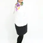 68cm×68cmの小判スカーフで、アスコットタイのようにシャツやブラウスの中におさめて使うこともできます。室内でも巻いたままでいられるので使いやすくなっています。