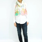 大判サイズのストールで肩から羽織る使い方もできます。春夏の日除けや室内の冷房対策としても使いやすくなっています。