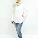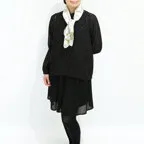 65cm×65cmの小判スカーフで、アスコットタイのようにシャツやブラウスの中におさめて使うこともできます。室内でも巻いたままでいられるので使いやすくなっています。