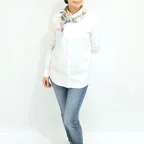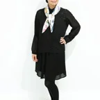 65cm×65cmの小判スカーフで、アスコットタイのようにシャツやブラウスの中におさめて使うこともできます。室内でも巻いたままでいられるので使いやすくなっています。