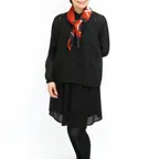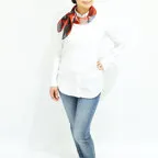 65cm×65cmの小判スカーフで、アスコットタイのようにシャツやブラウスの中におさめて使うこともできます。室内でも巻いたままでいられるので使いやすくなっています。