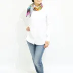 65cm×65cmの小判スカーフで、アスコットタイのようにシャツやブラウスの中におさめて使うこともできます。室内でも巻いたままでいられるので使いやすくなっています。