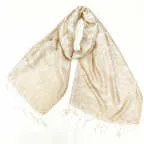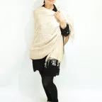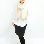 スタンダートな大判サイズで巻いても羽織っても、どちらも使いやすいタイプです。特に羽織は全体の印象がパッと華やかに、エレガントな雰囲気に変化します。