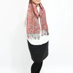 糸そのものの美しい光沢感を活かし、ジャカード織機で製作された繊細で上品なペイズリーデザインが装いに洗練された印象を与えてくれます。