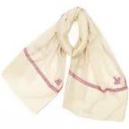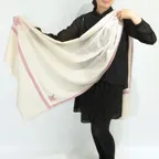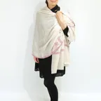 極細のカシミヤ糸を織り上げた、ふわっと軽く光沢のある極上素材。コントラストの効いた美しい手刺繍。風合い、デザイン共に他にはない一枚に仕上がっています。
