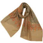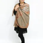 落ち着いたベースカラーに躍動感のある手刺繍を施した、作り手のセンスを感じさせるカシミヤストール。洋服やシーンを問わず合わせやすくなっています。