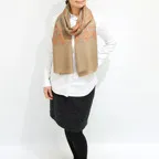 バランスの良い大判サイズで、巻きでも羽織でもどちらも使いやすいストールです。特に羽織は全面に施された刺繍が美しく輝き、サッとあしらうだけで全体の印象を大きく変えてくれます。