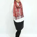 スタンダートな大判サイズで巻いても羽織っても、どちらも使いやすいタイプです。特に羽織は全体の印象がパッと華やかに、エレガントな雰囲気に変化します。