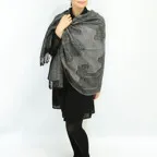 スタンダードな大判サイズで、首に巻くことはもちろん、室内でのひざ掛けにも、肩から羽織る使い方もできます。特に羽織りは、パッと華やかにエレガントな雰囲気に変わります。上半身を覆えるので、着ている服を気にせず合わせることができます。忙しい朝もコーディネートを気にする必要はありません。