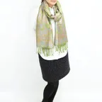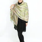 スタンダートな大判サイズで巻いても羽織っても、どちらも使いやすいタイプです。特に羽織は全体の印象がパッと華やかに、エレガントな雰囲気に変化します。