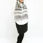 スタンダードな大判サイズで、首に巻くことはもちろん、室内でのひざ掛けにも、肩から羽織る使い方もできます。特に羽織りは、パッと華やかにエレガントな雰囲気に変わります。上半身を覆えるので、着ている服を気にせず合わせることができます。忙しい朝もコーディネートを気にする必要はありません。