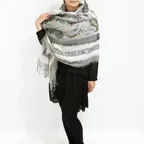 落ち着いた色使いでありながら、立体刺繍が程よいアクセントになる使いやすいストール。ウール特有のチクチク感が苦手な方でも安心して身につけることができます。