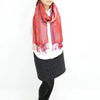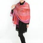 スタンダートな大判サイズで巻いても羽織っても、どちらも使いやすいタイプです。特に羽織は全体の印象がパッと華やかに、エレガントな雰囲気に変化します。