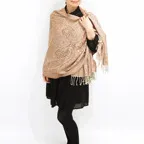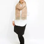 スタンダードな大判サイズで、首に巻くことはもちろん、室内でのひざ掛けにも、肩から羽織る使い方もできます。特に羽織りは、パッと華やかにエレガントな雰囲気に変わります。上半身を覆えるので、着ている服を気にせず合わせることができます。忙しい朝もコーディネートを気にする必要はありません。