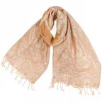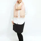 スタンダードな大判サイズで、首に巻くことはもちろん、室内でのひざ掛けにも、肩から羽織る使い方もできます。特に羽織りは、パッと華やかにエレガントな雰囲気に変わります。上半身を覆えるので、着ている服を気にせず合わせることができます。忙しい朝もコーディネートを気にする必要はありません。