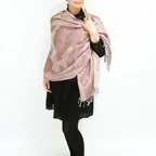 スタンダードな大判サイズで、首に巻くことはもちろん、室内でのひざ掛けにも、肩から羽織る使い方もできます。特に羽織りは、パッと華やかにエレガントな雰囲気に変わります。上半身を覆えるので、着ている服を気にせず合わせることができます。忙しい朝もコーディネートを気にする必要はありません。