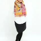 スタンダードな大判サイズで、首に巻くことはもちろん、室内でのひざ掛けにも、肩から羽織る使い方もできます。特に羽織りは、パッと華やかにエレガントな雰囲気に変わります。上半身を覆えるので、着ている服を気にせず合わせることができます。忙しい朝もコーディネートを気にする必要はありません。