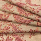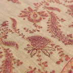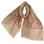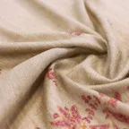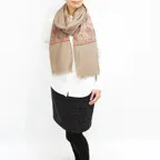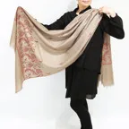 このカシミヤストールには最も繊細なインドカシミール地方ラダック産カシミヤ糸(パシュミナ)が使われています。そのため手織りカシミアストールの中でも最も目が細く繊細な生地となっています。薄くて軽くてやわらかい最上級の一枚です。