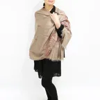 バランスの良い大判サイズで、巻きでも羽織でもどちらも使いやすいストールです。特に羽織は全面に施された刺繍が美しく輝き、サッとあしらうだけで全体の印象を大きく変えてくれます。