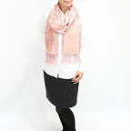 スタンダートな大判サイズで巻いても羽織っても、どちらも使いやすいタイプです。特に羽織は全体の印象がパッと華やかに、エレガントな雰囲気に変化します。