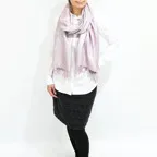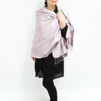 スタンダートな大判サイズで巻いても羽織っても、どちらも使いやすいタイプです。特に羽織は全体の印象がパッと華やかに、エレガントな雰囲気に変化します。