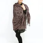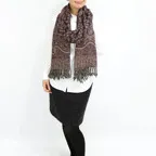 縦の長さが220cm、横幅105cmの特大ショールサイズで、ゆるっと巻くだけで立体的でボリューム感のある表情を作り出せます。広げて羽織れば上半身をすっぽりと覆うことができるのでトップスを気にせず合わせることができます。秋冬のアウター代わりにはもちろん、真夏の室内での冷房対策や膝掛けとしても使いやすくなっています。