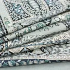 筆(カラム)を用いた模様は染色にはない繊細な色合いを生み出し、唯一無二のデザインに仕上がっています。さらにこの生地に熟練された職人がアーリ手刺繍を施しています。刺繍糸は全てシルク100%素材。色とりどりの刺繍糸を用いて表現された生地は美しい輝きを放ち、凹凸のない滑らかな質感を実現します。こうした完成した手仕事のショールはまさに芸術品。遠目にも伝わる高級感はあなたの装いに洗練された気品を与えてくれます。
