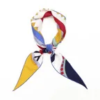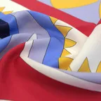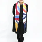 アーティスティックなデザインと発色の良さが際立つ一枚。シンプルに使うだけでアクセント効果が抜群のストールに仕上がっています。