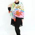 スタンダードな大判サイズで巻きでも羽織でもどちらでも使いやすくなっています。特に春夏の日除けや冷房対策としても使いやすく、ファッションのアクセントとしてなら一年中使うことができます。