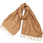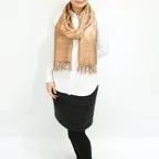 スタンダートな大判サイズで巻いても羽織っても、どちらも使いやすいタイプです。特に羽織は全体の印象がパッと華やかに、エレガントな雰囲気に変化します。