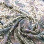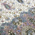 筆(カラム)を用いた模様は染色にはない繊細な色合いを生み出し、唯一無二のデザインに仕上がっています。さらにこの生地に熟練された職人がアーリ手刺繍を施しています。刺繍糸は全てシルク100%素材。色とりどりの刺繍糸を用いて表現された生地は美しい輝きを放ち、凹凸のない滑らかな質感を実現します。こうした完成した手仕事のショールはまさに芸術品。遠目にも伝わる高級感はあなたの装いに洗練された気品を与えてくれます。