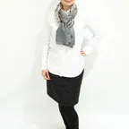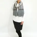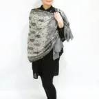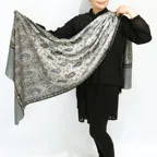 196cm×65cmのスタンダードな大判サイズで、巻きでも羽織でもどちらも使いやすいストールです。特に羽織は全面に施された刺繍が美しく輝き、サッとあしらうだけでエレガントな雰囲気に変化します。ドレスや着物などの羽織物としても重宝します。
