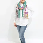 大判サイズのストールで肩から羽織る使い方もできます。春夏の日除けや室内の冷房対策としても使いやすくなっています。
