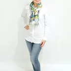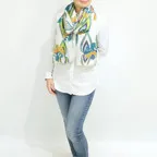 大判サイズのストールで肩から羽織る使い方もできます。春夏の日除けや室内の冷房対策としても使いやすくなっています。