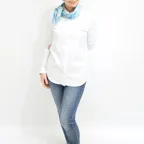 65cm×65cmの小判スカーフで、アスコットタイのようにシャツやブラウスの中におさめて使うこともできます。室内でも巻いたままでいられるので使いやすくなっています。