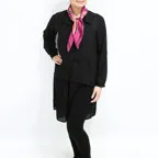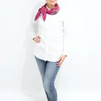 小ぶりなスクエアサイズで、アスコットタイのようにシャツやブラウスの中におさめて使うこともできます。室内でも巻いたままでいられるので使いやすくなっています。