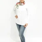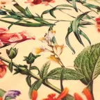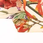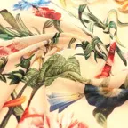 デザイン性の高いフラワーモチーフ。デイリーにもお出かけにも活躍、一枚で華やかな印象になる万能スカーフです。