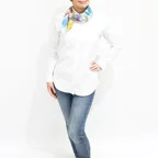 65cm×65cmの小判スカーフで、アスコットタイのようにシャツやブラウスの中におさめて使うこともできます。室内でも巻いたままでいられるので使いやすくなっています。