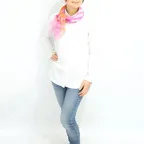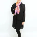 小ぶりなスクエアサイズで、アスコットタイのようにシャツやブラウスの中におさめて使うこともできます。室内でも巻いたままでいられるので使いやすくなっています。