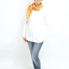 小ぶりなスクエアサイズで、アスコットタイのようにシャツやブラウスの中におさめて使うこともできます。室内でも巻いたままでいられるので使いやすくなっています。
