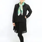 小ぶりなスクエアサイズで、アスコットタイのようにシャツやブラウスの中におさめて使うこともできます。室内でも巻いたままでいられるので使いやすくなっています。